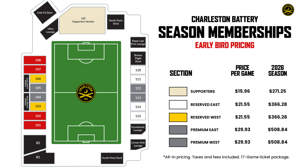 Call 843-971-GOAL (4625), or email membership@charlestonbattery.com for more details.