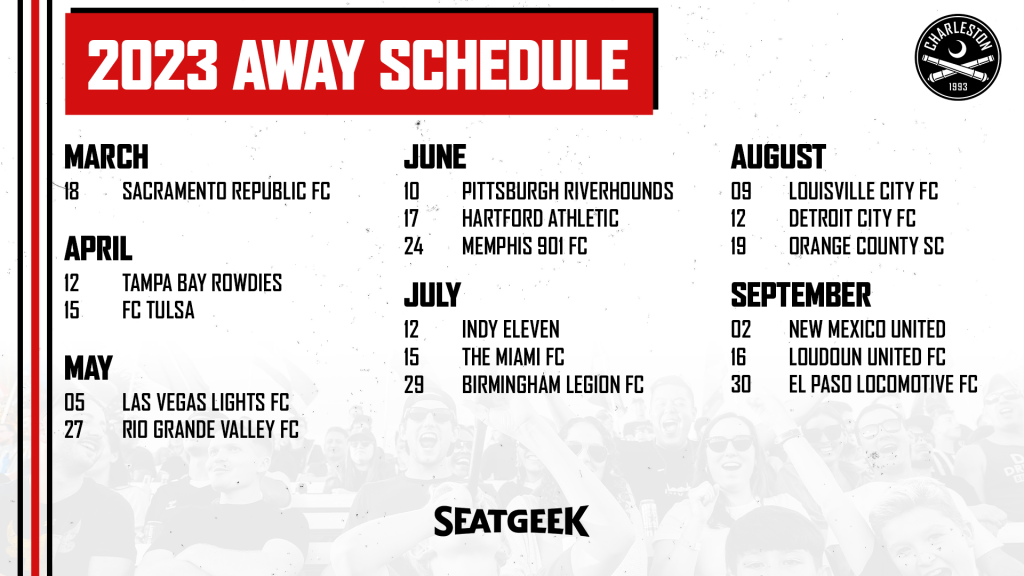Charleston will play a 34-match schedule across 32 weeks from March through October. While still subject to change, all home matches will kick off at 7:30 p.m. ET except for three, the May 20 game against Monterey Bay FC and the final two games of the regular season, which will start at 5 p.m. ET.