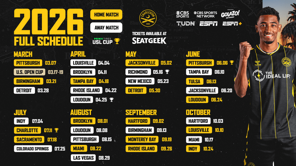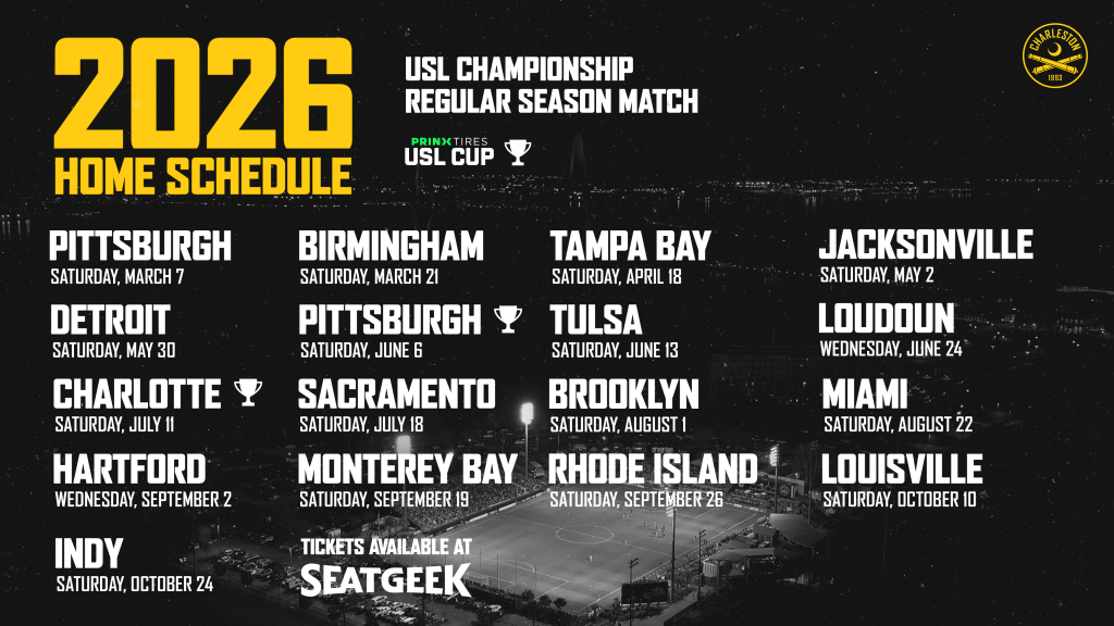 In 2026, Charleston will play a 34-match schedule across 34 weeks from early March through late October. The schedule is comprised of 30 regular season contests and four Prinx Tires USL Cup group stage matches.